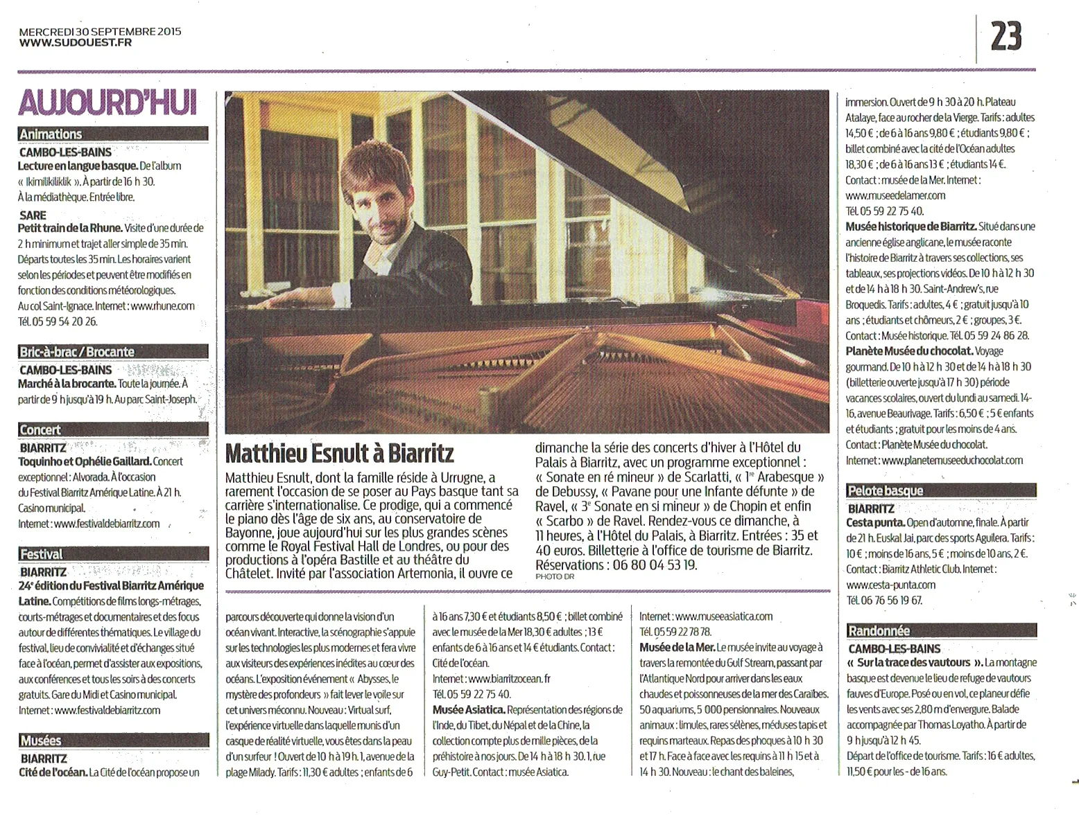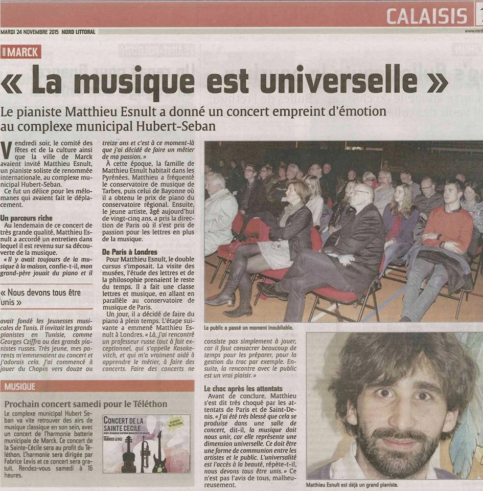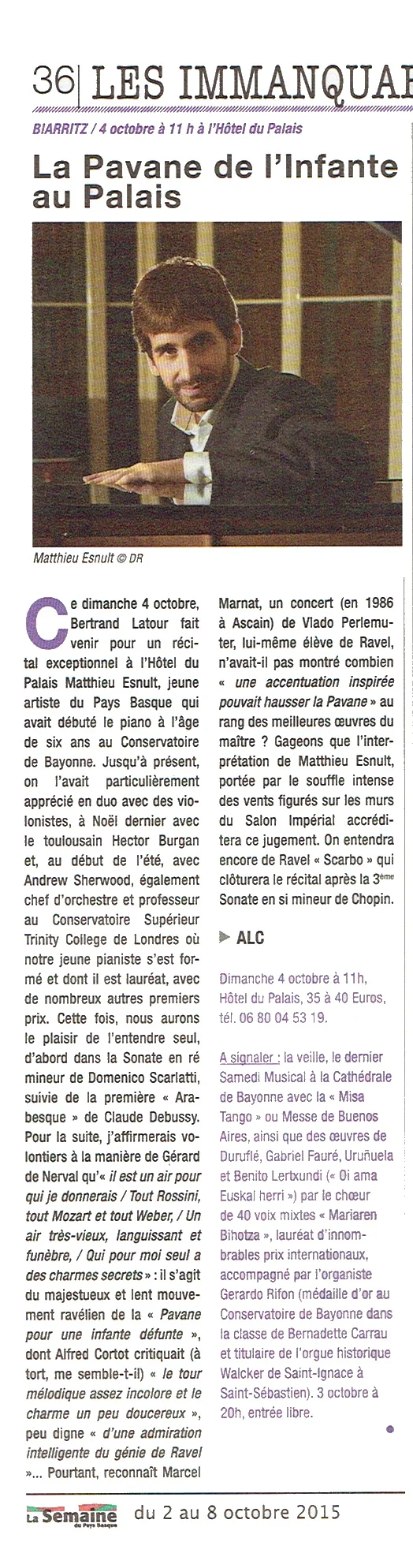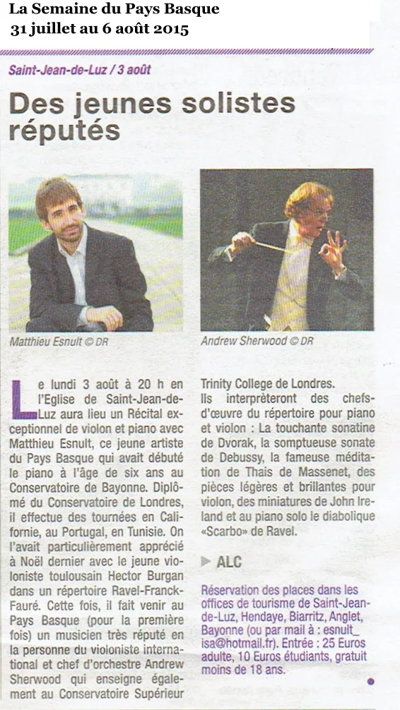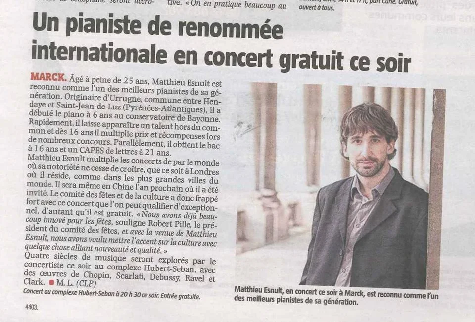 “Vendredi soir, à Ciboure, deux jeunes artistes du Pays basque font une pause dans leur vie londonienne pour un récital. Rencontre avec Matthieu Esnult, pianiste de génie.